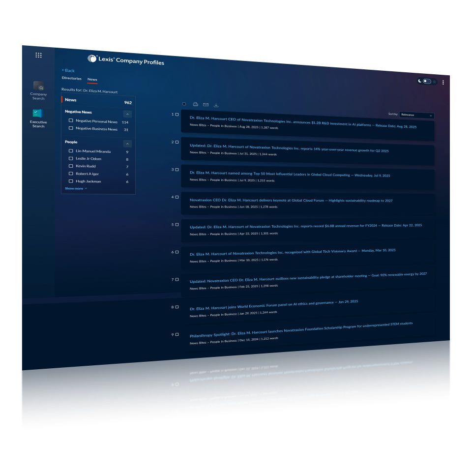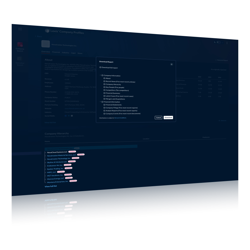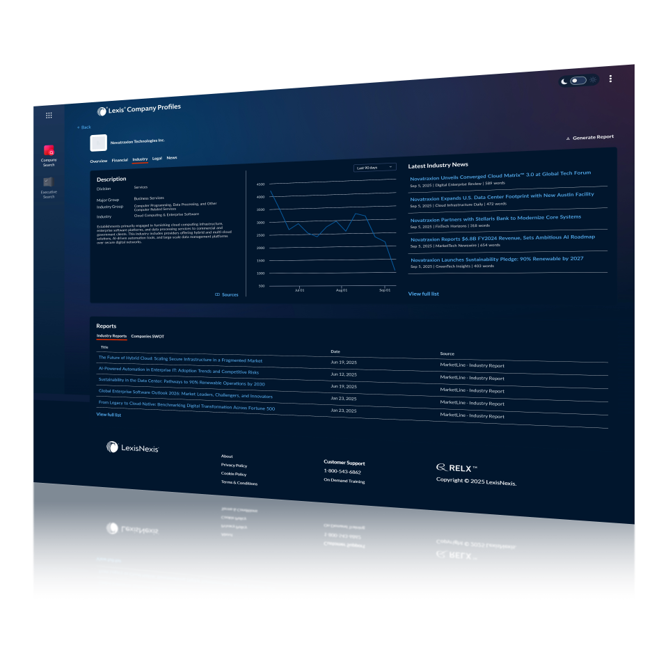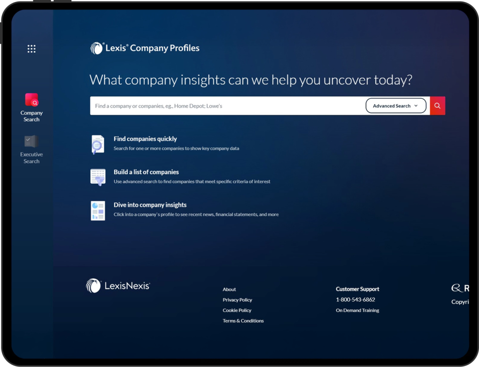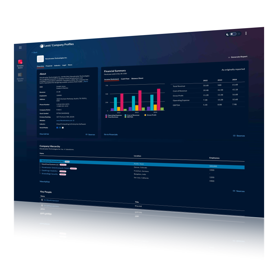 Lexis Company Profiles is a company research and due diligence tool providing comprehensive profiles on millions of public and private companies worldwide. It combines financials, executives, litigation history, IP assets, industry data, and news in one intuitive platform.